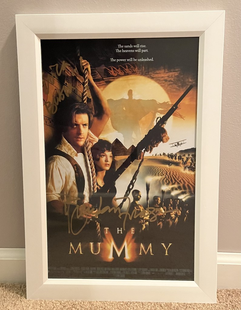 I am starting this series with my all-time favorite movie, The Mummy (1999). The cast includes; Brendan Fraser(Rick O’Connell), Rachel Weisz(Evelyn/Evie), Arnold Vosloo (Imhotep), John Hannah(Jonathan), Oded Fehr(Ardeth), and many more! This movie came out in May of 1999 and changed my view on movies. I grew up in a family who loved movies and going to see them in theaters. We even saw this in theaters three times on the SAME DAY. It was just a dad and his four kids watching the movie over and over again. The Mummy is one of the first movies that made me fall in love with films. As you see above, how much I love this movie, I even have a signed movie poster from Brendan Fraser!